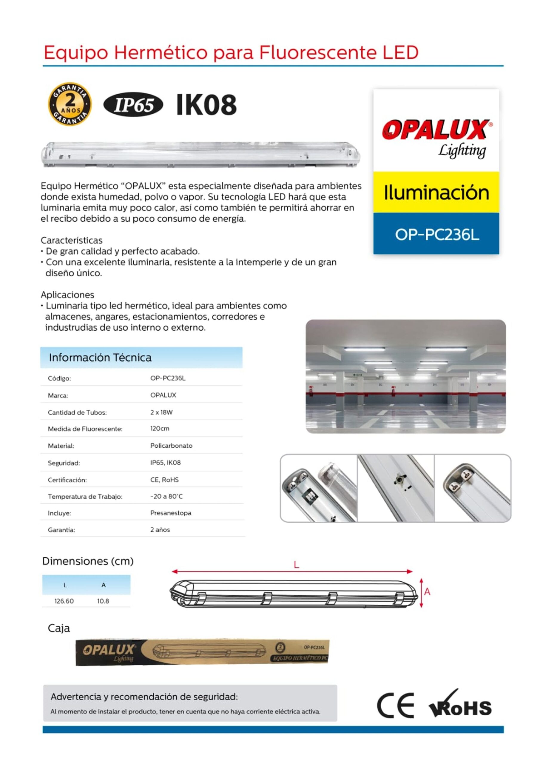 Equipo Hermético “OPALUX” está especialmente diseñada para ambientes donde exista humedad, polvo o vapor. Su tecnología LED hará que esta luminaria emita muy poco calor, así como también te permitirá ahorrar en el recibo debido a su poco consumo de energía.