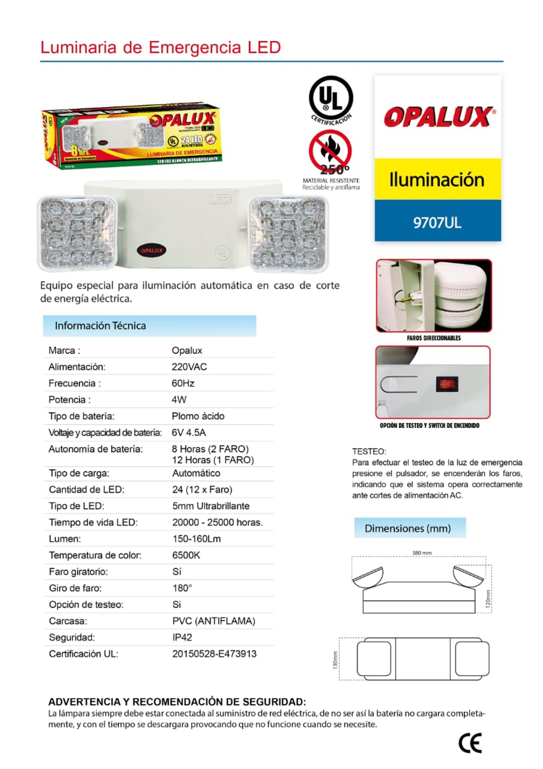 LAMPARA DE EMERGENCIA 8 HORAS UL OPALUX